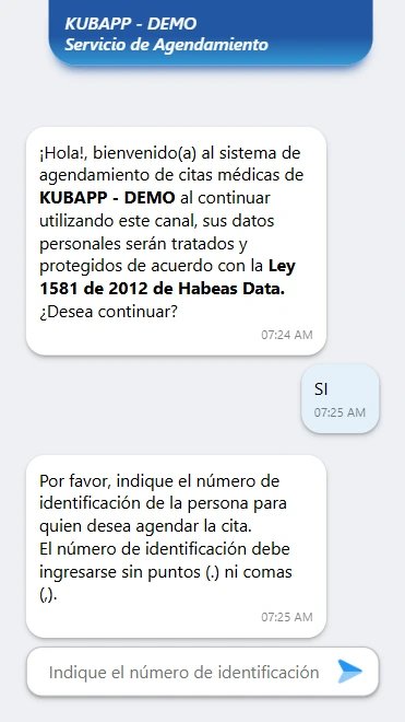 Su funcionalidad clave es la capacidad de gestionar citas médicas de manera automatizada, alimentando directamente KubApp Gestión Salud con la información de cada agendamiento, sin intervención humana.